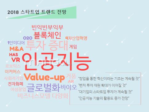 ◇다가올 2018년을 바라보는 스타트업의 시선=“2018년 스타트업 트렌드는 인공지능“ 설문 참가자의 41%가 이같이 답했다. 4차 산업혁명시대 인공지능은 이미 거스를 수 없는 추세라는 의견이었다. 인공지능은 데이터, 블록체인과 함께 투자 유망 업종라는 것이다. 길창군 더벤처스 디렉터는 ”프로그래밍 모델에 인공지능 시스템이 접목해 상호작용하는 서비스로 확장될 것“으로 내다봤다.