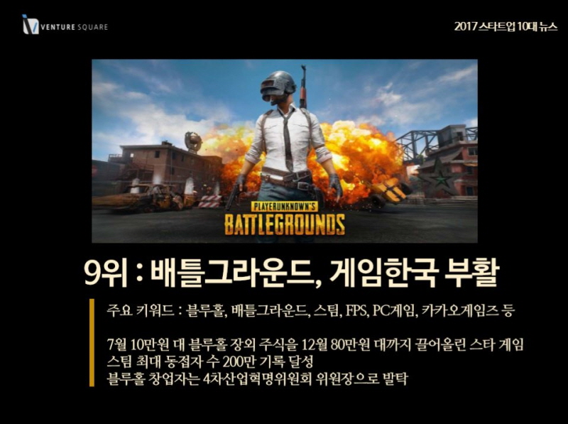 배틀그라운드을 개발한 곳은 바로 국내 게임 개발사인 블루홀이었다. 덕분에 블루홀도 장외주식시장에서 폭발적인 관심을 받았다. 7월 10만원 대였던 장외주식이 12월 80만원대까지 치솟으며 반년만에 기업가치가 수직상승했다. 지난 9월 장병규 블루홀 이사회 의장은 4차산업혁명위원회 수장으로 발탁되며 민간 주도의 혁신에 시동을 걸었다.