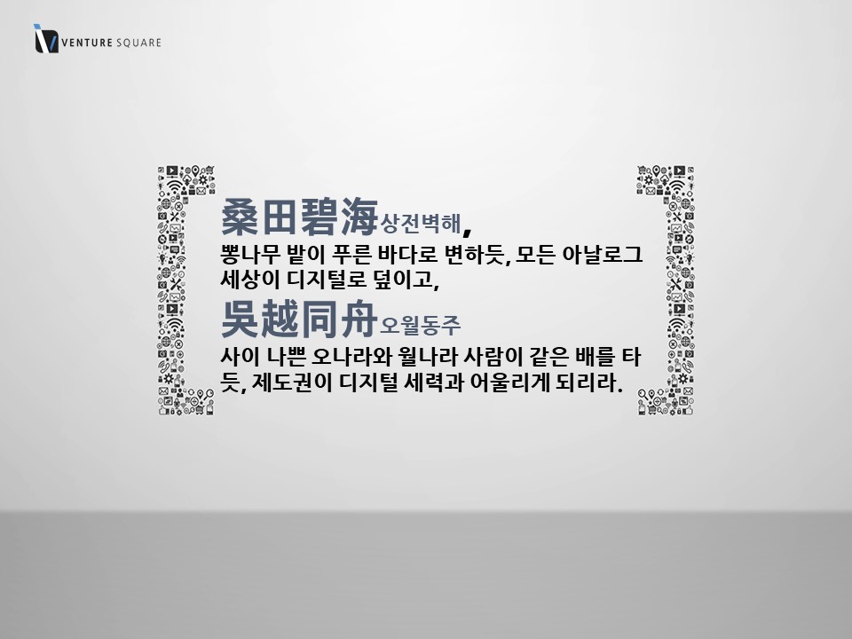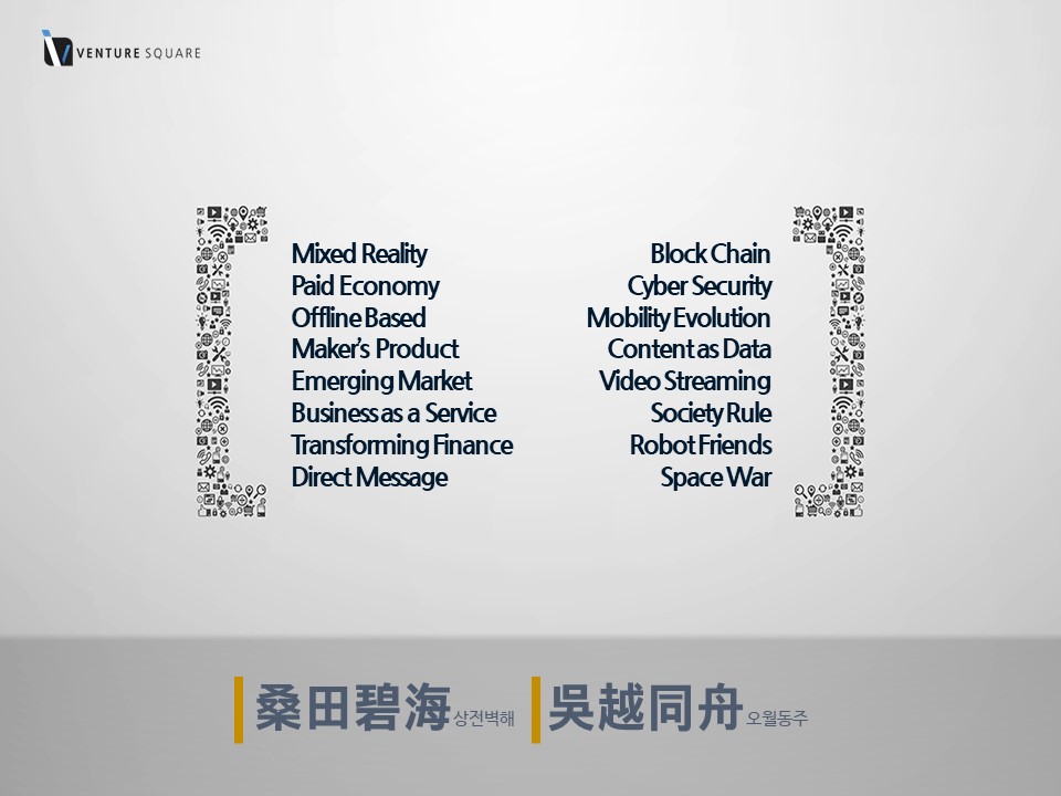 무술년(戊戌年) 스타트업이 주목할 만한 트렌드에는 어떤 게 있을까. 벤처스퀘어 투자팀이 ‘스타트업이 주목할 만한 2018 트렌드 16’을 선정 발표했다. 한 해를 관통할 16가지 트렌드를 아우르는 말은 상전벽해(桑田碧海)와 오월동주(吳越同舟). 뽕나무 밭이 푸른 바다로 변하듯 모든 아날로그 세상이 디지털로 덮이고 사이 나쁜 오나라와 월나라 사람이 같은 배를 타듯 제도권이 디지털 세력과 어울리게 된다는 뜻을 담고 있다.