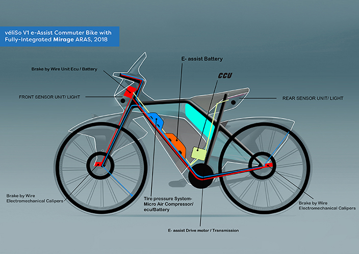 이 제품은 속도 감지 등 각종 센서와 브레이크, 타이어 압력을 전자 제어하는 장치 등 첨단 장비를 갖추고 있다. 안장 아래쪽에는 블랙박스를 갖추고 있다. 만일 자전거가 전복될 것 같은 위험을 감지하면 핸들과 안장에 진동을 통해 알려준다. 그래도 감속하지 않으면 자동으로 후륜에 이어 전륜 순으로 브레이크를 효과적으로 제어한다. 위험 상태에서 아무 것도 하지 않으면 알아서 완전히 정지하게 하는 것.