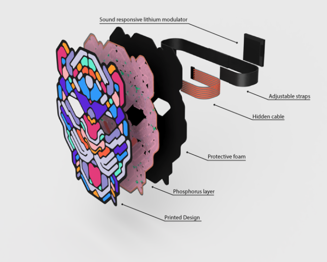 마스크 종류는 사람 얼굴 뿐 아니라 로봇, 동물 모양 같은 걸 할 수도 있다. 주위 소리에 맞춰 빛나는 부분의 경우 끊임없이 변화하면서 다양한 패턴을 보여준다. 본체는 머리에 쓸 수 있게 고정식 밴드로 이뤄져 있어 격렬한 춤을 출 때에도 마스크가 떨어질 염려가 없다고. 어둠 속에서 다른 사람들에게 자신을 강하게 표현하거나 분위기를 북돋워줄 수 있는 아이템이라고 할 수 있다.