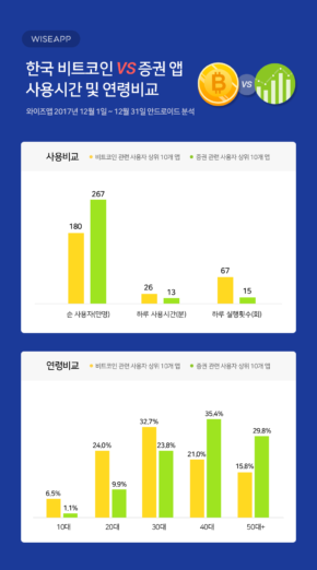 앱분석 업체 와이즈앱에 따르면 지난 12월 국내 안드로이드 스마트폰 사용자를 대상으로 조사한 결과 비트코인앱의 경우 월 사용자 180만 명, 하루 26분, 67회를 이용한 반면, 증권앱은 월 사용자 267만 명, 하루 13분, 15회 접속했다. 비트코인앱 이용자는 증권앱 대비 사용시간은 2배, 실행은 4배 이상 많이 이용한다는 얘기다.