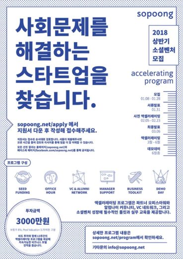 에스오피오오엔지가 이번 달 28일까지 신생 및 초기 소셜벤처를 대상으로 ‘2018년 상반기 소셜벤처 투자 모집’을 진행한다. 이번 소셜벤처 모집에 선발되는 경우 3000만원 즉시 투자와 전문 액셀러레이팅 프로그램이 제공된다. 액셀러레이팅은 비즈니스의 성장을 가속하기 위한 과정으로 벤처 경험이 풍부한 파트너와 매니저가 팀에 배정돼 13주 동안 사업 전반에 걸친 컨설팅 등을 지원한다.
