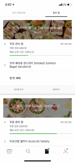 레스토랑에서 주문을 확인하고 배송완료까지의 전 과정은 우버이츠 앱에서 확인 가능하다. 한 개는 집에 포장해 가야겠다는 욕심에 덜컥 ‘연어 베이글 샌드위치’를 한개 더 주문했다. 주문이 시작되면 ‘주문경로 확인’ 기능을 통해 주문한 음식의 위치를 실시간으로 확인할 수 있다.