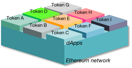 예를 들어 용인(이더리움 네트워크)에 있는 워터파크(dApp 1, 서비스 플랫폼)에 들어가기 전에 원화(이더)를 사용해 방수 팔찌(월렛, 지갑)에 워터파크 전용 돈(토큰)을 충전해 사용하는 것과 비슷한 개념이라고 보면 된다. 워터파크에서 충전한 팔찌를 에버랜드(dApp 2)에서 사용할 수 없듯 각 토큰은 자기 플랫폼 안에서의 목적만을 수행한다.