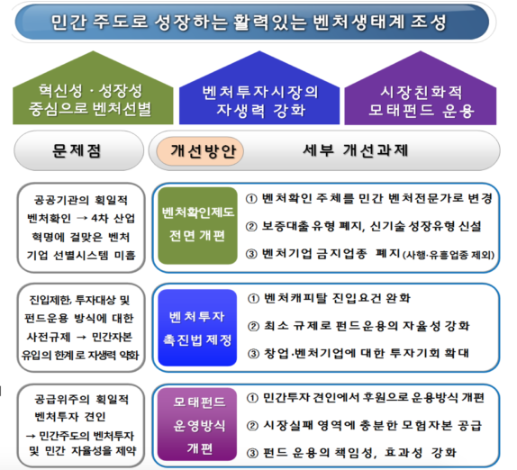 이번에 발표한 대책은 민간 주도로 성장하는 활력있는 벤처생태계 조성을 위한 첫걸음으로 벤처확인제도, 벤처투자제도, 모태펀드 등 벤처기반 제도를 근본적으로 혁신하는 게 기본 골자다.