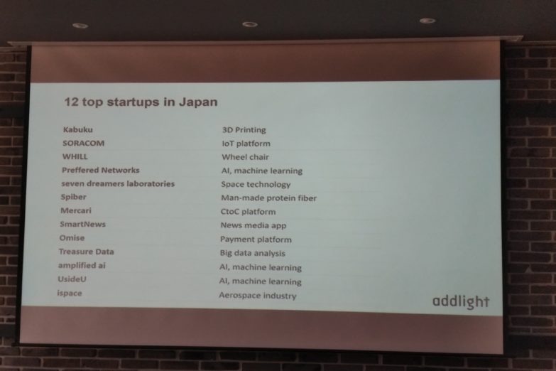 일본 테크 트렌드를 전한 후 애드라이트는 자사 선정 일본 유망 스타트업을 소개했다. 유망 기업은 카부쿠(Kabuku), 소라컴(SORACOM), 윌(WHILL), 프리퍼 네트워크(Preffered networks), 세븐드리머랩(Seven dreamers laboratories), 스파이버 (spiber), 머카리(Mercari), 스마트뉴스(smart news), 오미세(omise), 트레져 데이터(treasure Data), 앰플리파이드 ai (amplified ai), 유사이드유(UsideU), 아이스페이스(ispace) 등 12곳이다. 소개 스타트업 모두 3D 프린팅, Iot 플랫폼, 빅데이터, AI, 머신러닝, 핀테크 분야의 테크기업이 차지한 만큼 일본에서의 기술 기업에 대한 기대와 전망은 크다.