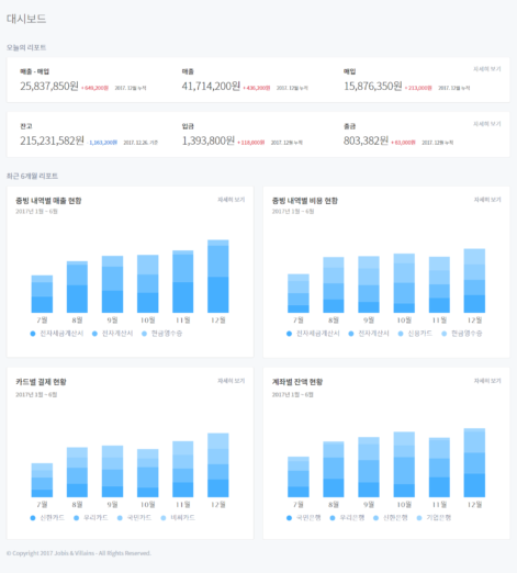 자비스 이용자는 그간 유료 고객에게만 제공됐던 자비스 대시보드에서 회사의 매출·매입, 잔고 현황 등의 종합 금융정보를 실시간으로 확인할 수 있다. 증빙 내역별 매출·매입 현황, 카드별 결제 현황, 계좌별 잔액 현황도 함께 볼 수 있다. 기존에 무료로 제공하던 영수증 애플리케이션에 더해 통합적인 금융정보 조회 및 관리가 가능해진 셈이다.