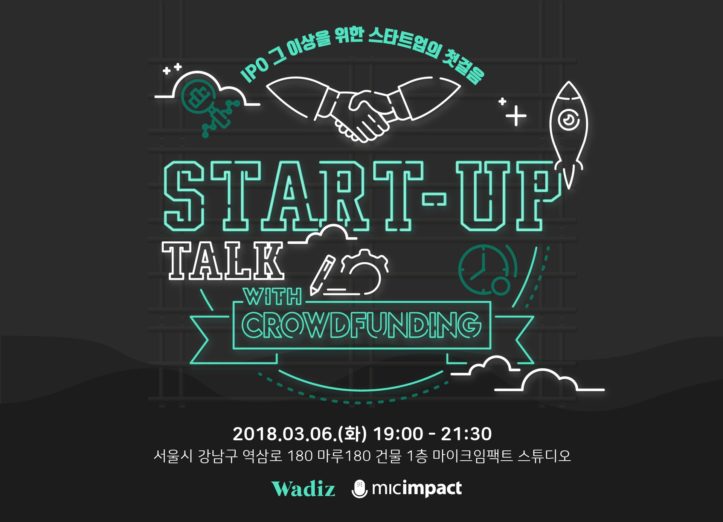 본사에서 진행되는 투자형 크라우드펀딩 교육에서는 펀딩 시작 전 준비팀이 반드시 알아야 할 체크리스트, 최신 사례를 통한 성공 노하우 등이 소개된다. 3월 6일에는 마이크임팩트 스튜디오에서 ‘Start-up TALK’ 행사가 진행될 예정이다. 저녁7시부터 진행되는 이번 행사에는 ‘스타트업 생존전략’ 및 ‘펀딩으로 1억 투자 받기’ 등의 다양한 주제와 창업가 패널 토크, 네트워킹 프로그램이 준비돼 있다. 스타트업에 관심이 있는 사람이면 누구나 참석 가능하며 와디즈 스쿨 페이지에서 신청할 수 있다.