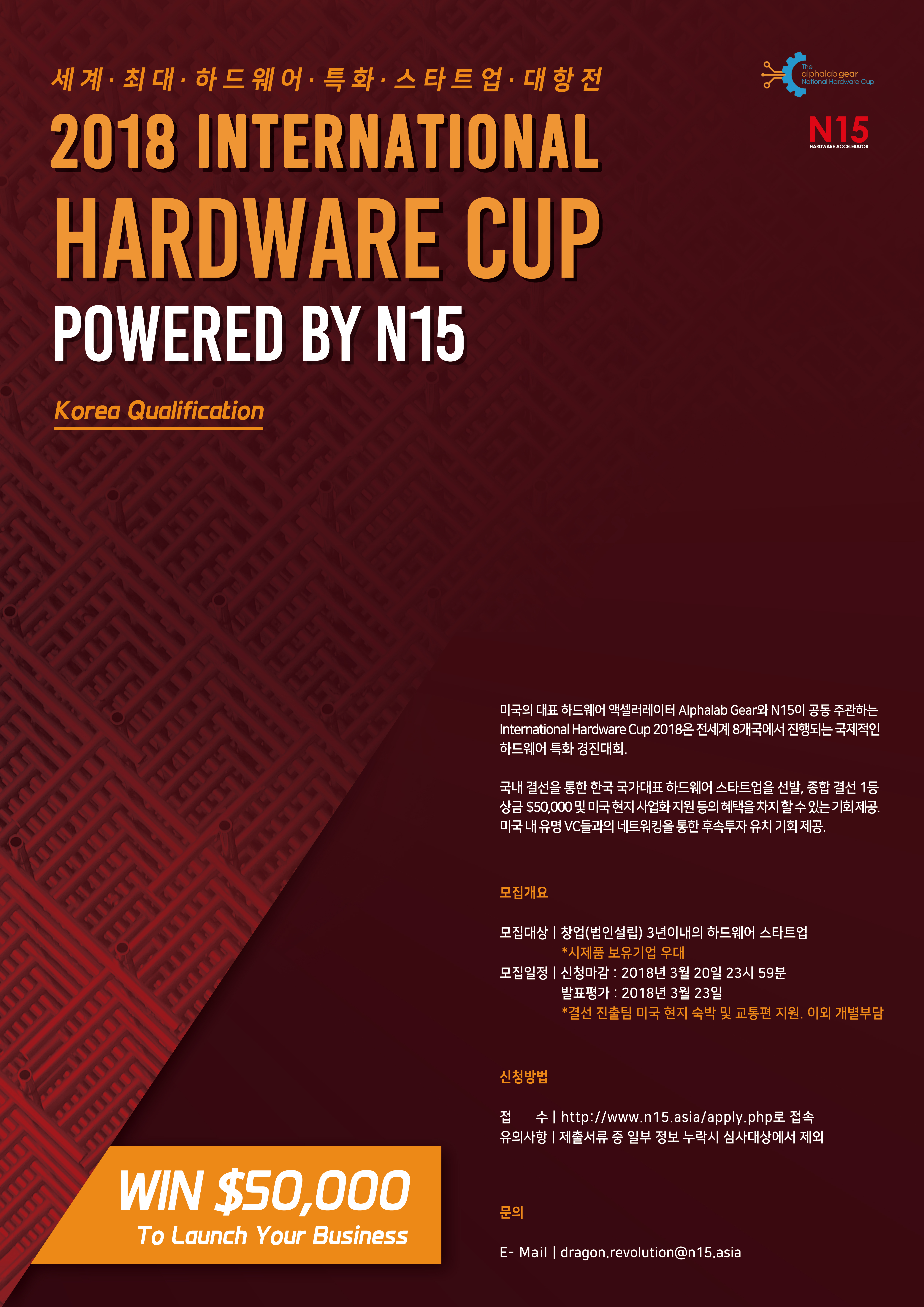 하드웨어 액셀러레이터 N15과 미국 대표 하드웨어 액셀러레이터 알파랩 기어 (Alphalab Gear)가 2018 인터내셔널 하드웨어 컵 (2018 International Hardware Cup, 이하 하드웨어컵)에 참여할 국가대표 하드웨어 스타트업을 선발한다고 22일 밝혔다.