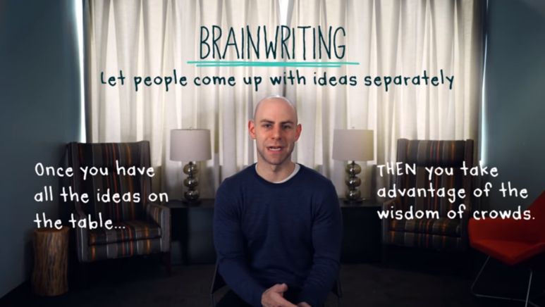 ◇ 브레인스토밍? 이젠 브레인라이팅 시대=애덤 그랜트(Adam Grant)는 오리지널스, 기브앤테이크, 옵션B의 저자이자 펜실베이니아주립대학 와튼스쿨 교수다. 그는 창업가는 모두 새로운 아이디어가 필요하며 새로운 제품을 출시해야 하고 최대한 창의적 아이디어가 필요하다고 말한다. 이런 이유로 자신들이 아는 가장 혁신적인 사람을 모아서 브레인스토밍 회의를 연다.