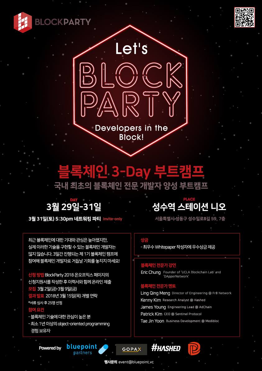 블루포인트파트너스가 국내 최초로 시도하는 블록체인 전문 개발자 양성 과정 블록파티는 블록체인 분야에 관심 있는 개발자가 블록체인 기술에 대한 이론과 활용에 대한 지식을 습득하고 이를 실제 디앱 개발과 백서작성으로 구현하는 것을 목표로 한다.