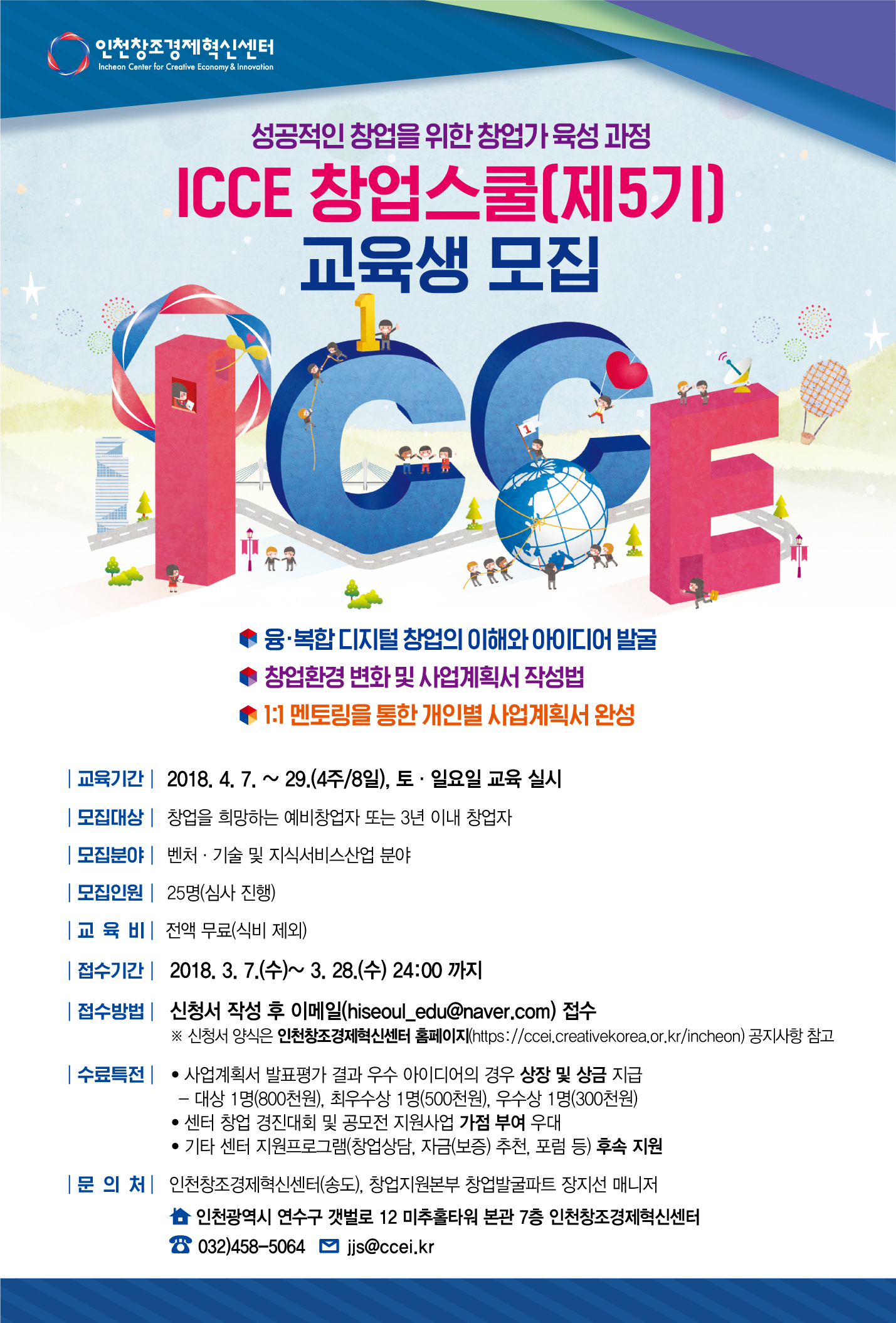 ◇성공적인 창업을 위한 창업가 육성 과정 ‘ICCE 창업스쿨 제5기’ 개최=인천창조경제혁신센터가 예비창업자 및 초기 스타트업의 성공적인 창업을 위한 통합 교육 프로그램 ‘ICCE 창업스쿨(제5기)’에 참여할 교육생을 3월 28일 수요일까지 모집한다.