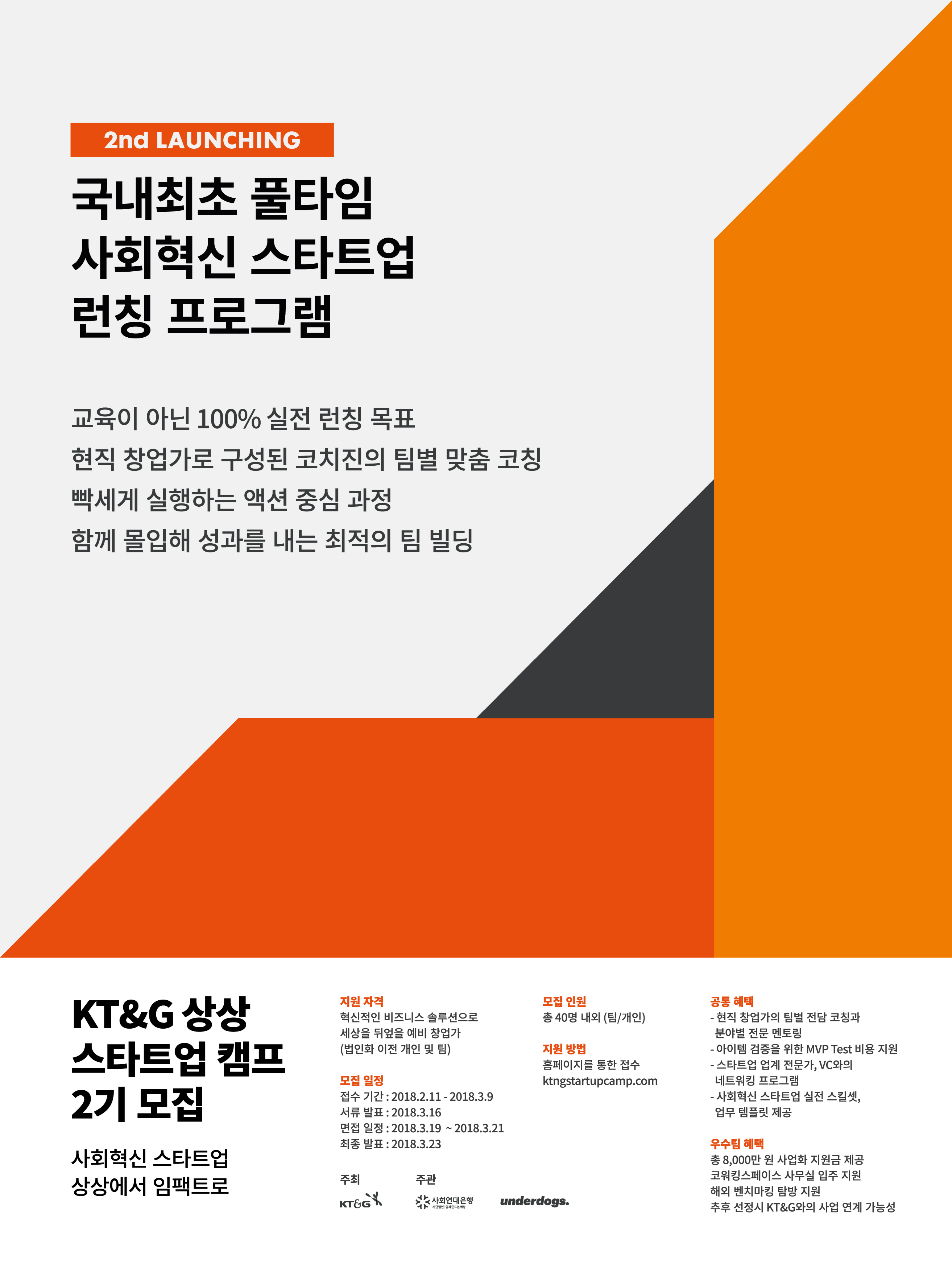 전 과정은 사회공헌 차원에서 무료로 진행된다. 사회문제 해결에 관심이 있는 청년들이면 누구나 참여 가능하다. 합격자 발표 후 4월 2일부터 KT&G 상상마당 홍대에서 14주간의 교육 프로그램이 진행되며 신청은 여기에서 할 수 있다.