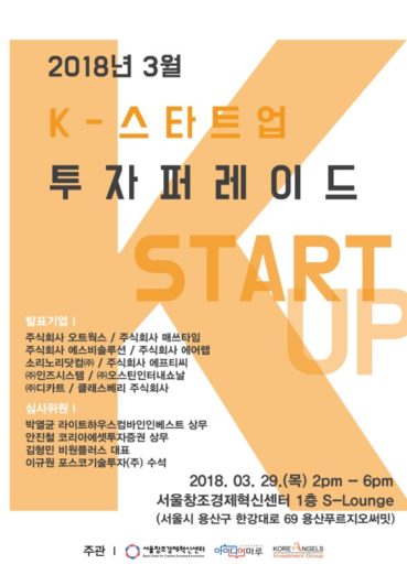 ◇[3월 29일 목] k-스타트업 투자 퍼레이드=서울창조경제혁신센터가 주최하는 ‘K-스타트업 투자퍼레이드’가 오는 3월 29일 목요일 14시부터 용산 푸르지오 써밋 오피스텔1층 S-라운지에서 열린다. 이번 행사에서 △주식회사오트웍스 △주식회사매쓰타임 △주식회사에스비솔루션 △주식회사에어랩 △소리노리닷컴㈜ △주식회사에프티씨 △㈜인즈시스템 △㈜오스틴인터내쇼날 △㈜디카트 △클래스베리 주식회사 이상 10팀이 발표 예정이다.