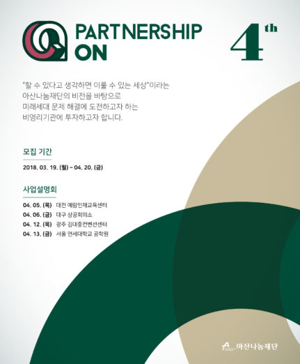 ◇[4월 5일~13일] 파트너십온 4기 모집 사업설명회=아산나눔재단이 비영리 기관 액셀러레이팅 프로그램인 ‘파트너십 온’ 4기 혁신리더를 모집하기 위한 사업 설명회를 개최한다. 파트너십 온은 아산나눔재단이 미래세대를 위한 사업을 펼치는 비영리 기관을 혁신리더로 지정해 ‘벤처기부’ 방식을 통해 재정적·비재정적으로 지원하는 프로그램이다.