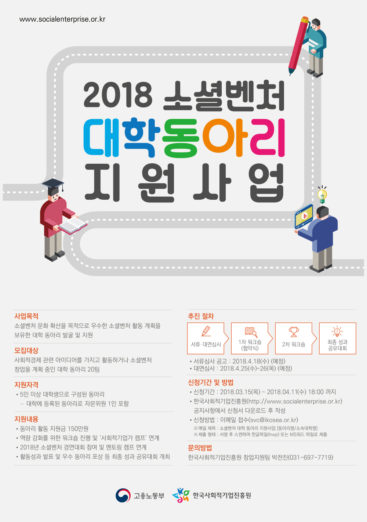 ◇2018년 소셜벤처 대학 동아리 모집=고용노동부와 한국사회적기업진흥원이 청년들의 다양한 소셜벤처 활동을 지원하기 위한 ‘2018년 소셜벤처 대학 동아리 지원사업(이하 ‘동아리 지원사업’)‘에 참여할 동아리를 모집한다.
