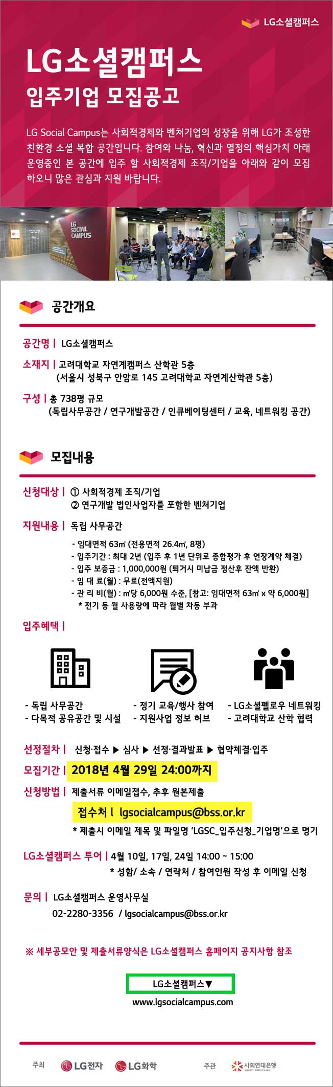 ◇LG소셜캠퍼스 공간 입주기업 모집=사회연대은행이 주관하는 LG소셜캠퍼스에서 이달 29일까지 상반기 신규 기업을 모집한다.