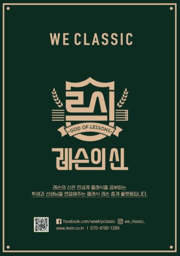 위클래식(WE CLASSIC)이 선보인 레슨의 신은 클래식 레슨 중개 플랫폼이다. 성악이나 반주, 피아노, 관현악, 작곡, 지휘 등 클래식 관련 전공은 물론 뮤지컬 보컬까지 원하는 전공이나 파트를 검색해 레슨을 고를 수 있으며 신청과 결제까지 끝낼 수 있다.