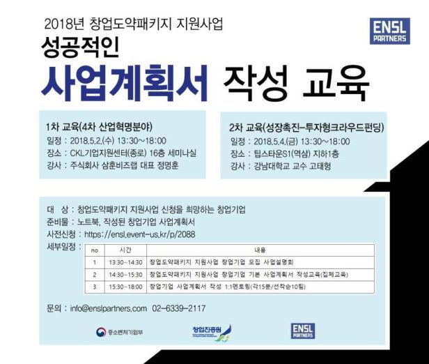 ◇ [5월 2~4일] 창업도약패키지 지원사업 사업계획서 작성교육=2018년 창업도약패키지 지원사업 창업기업 성공적인 사업계획서 작성 교육이 5월 2일과 4일 열린다. 이번 행사는 엔슬파트너스가 주관하고 중소벤처기업부, 창업진흥원에서 전담해 열린다.