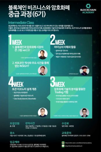 중급과정에서는 비트코인 역사를 모두 되돌아보고 사건 하나하나가 갖는 의미를 되짚어본다. 합의 알고리즘에 따른 채굴 방식 이해, 암호화폐의 기술적 분석을 통한 트레이딩, 토큰이코노미 설계를 통해서 암호화폐를 스스로 보고 가치판단을 내릴 수 있는 능력을 키울 수 있게 돕는다. 교육은 블록체인 아카데미 입문반 수료자를 대상으로 하며 5월 10일, 17일, 25일, 6월 1일 강남빌딩 17층 블록체인에서 열린다. 교육에 대한 자세한 내용은 이곳에서 확인할 수 있다.
