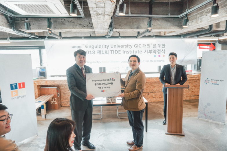 이 대표는 27일 팹랩서울에서 열린 SU(Singularity University 이하 ‘SU’) 기부금 약정식에서 매년 1억원씩 총 5년간 기부를 약속했다. 이 대표가 전달하는 기부금은 SU G.I.C(Grand Impact Challenge) 개최와 참가자 장학금으로 쓰일 예정이다.