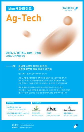 ◇블루포인트파트너스, 스마트 농업기술 세미나 ‘블루새틀라이트’ 개최=테크 전문 액셀러레이터 블루포인트파트너스가 농업 분야 스타트업의 어그리테크를 주제로 한 기술 세미나 ‘블루 새틀라이트’를 5월 10일 개최한다.