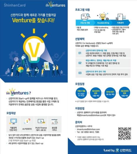 ◇신한카드, 스타트업 협력지원 프로그램 ‘I’m Ventures’모집= 신한카드가 스타트업 협력 지원 프로그램 ‘신한카드 I’m Ventures’를 모집한다.