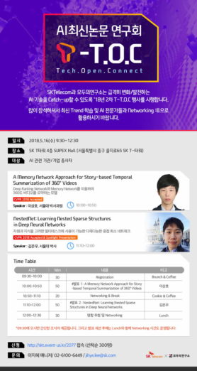 ◇ [5월 16일 수] 2018년 2차 AI최신 논문 연구회=SK텔레콤이 최신 인공지능(AI) 기술을 공유하고 토론하는 AI 최신 논문 연구회 ‘T-T.O.C(Tech. Open. Connect, 티톡)’를 개최한다. 5월 16일 수요일 9시 30∼12시 30분까지 서울 을지로에 위치한 SK텔레콤 T타워 4층 수펙스홀에서 AI 관련 기관과 기업 종사자를 대상으로 진행된다.
