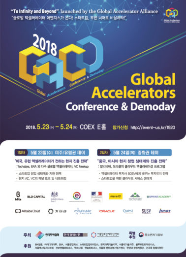 ◇[5월 23~24일] 2018 Global Accelerators Conference&Demoday=서울창조경제혁신센터와한국무역협회, 한국경제신문이 ‘2018 글로벌 액셀러레이터 컨퍼런스&데모데이’를 5월 23∼24일 양일간 코엑스 E-Hall에서 개최된다. 행사 1일차에는 글로벌 스타트업 트렌드 및 미래전망을 논하고 미국, 유럽권 액셀러레이터에게 스타트업 트렌드와 진출 전략에 대해 듣는 시간을 갖는다. 2일차에는 중화권 액셀러레이터의 스타트업 트렌드와 진출 전략, 네트워킹 예정이다. 참가 기업은 △Alibaba Clude △B8ta △BLD Capital △DIT △ERA △FrenchTech △iMakerbase △ The Landing △MARIA01 △Molecular HUB △Oracle △Quest Ventures △SOSV △TECHSTARS △Softbank Cloud △Sprint Academy다. 참가 신청은 5월 24일 목요일 오후 7시 30분까지이며 행사에 대한 자세한 내용은 이곳을 통해 확인할 수 있다.