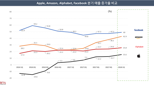 애플과 아마존, 구글 모기업인 알파벳, 페이스북 등 4대 플랫폼의 1분기 실적은 어떨까. 로아컨설팅이 로아데일리를 통해 공개한 4대 플랫폼 사업자의 1분기 실적 분석 보고서에 따르면 분기별 매출 증가율이 가장 높은 곳은 아마존으로 나타났다.