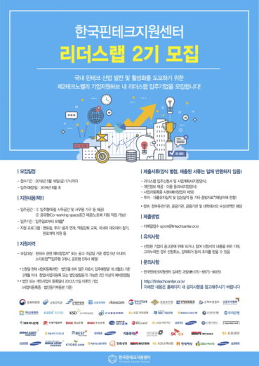 ◇한국핀테크지원센터, 리더스랩 2기 모집=한국핀테크지원센터가 「리더스랩 2기」 입주기업을 오는 5월 18일까지 모집한다.