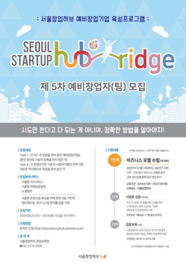 ◇ 서울창업허브, 허브릿지 5기 참가자 모집=서울창업허브가 5월 23∼6월 15일까지 예비창업기업 육성프로그램 허브릿지(Hub-ridge) 5기 1단계 참가자를 모집한다. 허브릿지는 유망 아이디어를 보유한 예비창업자와 전 주기 창업 보육 플랫폼인 서울창업허브를 이어주는 예비창업기업 육성 프로그램. 이를 통해 예비창업자는 아이디어를 검증하고 고도화하는 액션러닝 방식으로 단계별 프로그램을 진행, 준비된 초기 스타트업 육성을 기대할 수 있다.
