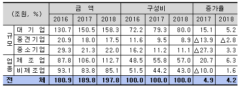 2018년 설비투자 동향은 지난해 국내 기업 설비투자 실적과 올해 계획을 추정한 것으로 조사 대상은 모두 3,700개다. 규모별 비중을 보면 중소가 1,785개로 가장 많고 중견 1,066개, 대기업 849개 순이다. 물론 투자액 기준으로 보면 제조업과 대기업 중심 투자 확대가 예상된다. 제조업은 반도체와 디스플레이가 전체 설비 투자를 주도하며 자동차의 경우 친환경차와 자율주행 관련 투자 확대가 예상된다. 비제조업의 경우 전기 가스와 통신 업종이 주도할 것으로 보인다.