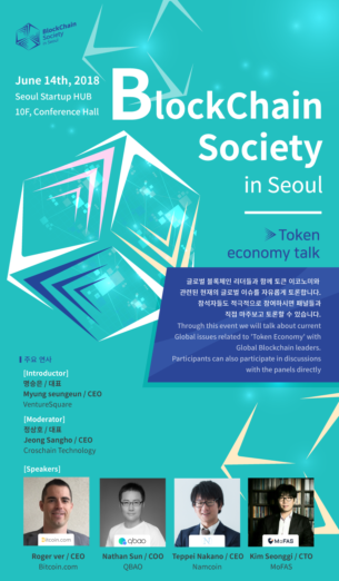 ◇ [6월 14일 목] 제2회 블록체인 소사이어티 인 서울=제2회 블록체인 소사이어티 인 서울이 오는 6월 14일 오후 7시부터 서울창업허브 10층 대강당에서 개최된다. 이번 행사는 글로벌 블록체인 리더들과 함께 토큰 이코노미와 관련된 현재의 글로벌 이슈를 자유롭게 토론하는 자리가 될 것이다. 연사로 △명승은(벤처스퀘어, CEO) △정상호(크로스체인테크놀로지, CEO) △Roger ver(Bitcoin.com, CEO) △Nathan Sun(QBAO, COO) △Teppei Nakano(Namcoin, CEO) △Kim Seonggi(MoFAS, CTO)가 이야기할 예정이다. 이번 제2회 블록체인 소사이어티 인 서울은 영어로 진행 되며 통역이 제공되지 않는다. 블록체인 소사이어티 인 서울이 주최하고, 벤처스퀘어, 블록체인 아카데미, 블록인프레스, 지디넷코리아, 크로스체인테크놀로지가 주관하여 개최된다. 블록체인 소사이어티 인 서울은 배달 정기적으로 밋업을 진행한다. 행사에 대한 자세한 내용은 이곳을 통해 확인할 수 있다.