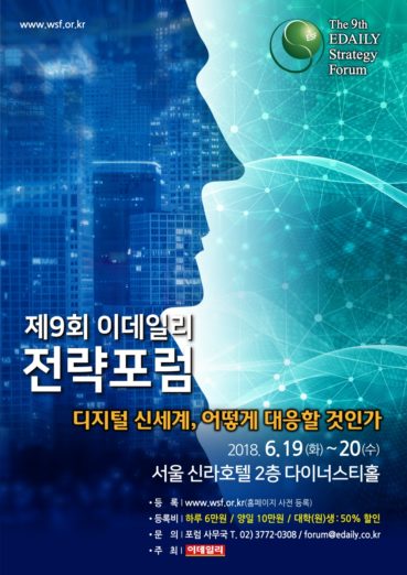 ◇ [6월 19일~20일] 제9회 이데일리전략포럼=이데일리가 6월19일과 20일 서울 중구 장충동 신라호텔에서 ‘디지털 신세계:어떻게 대응할 것인가’란 주제로 제9회 이데일리 전략포럼을 개최한다. 이번 포럼에는 금융위기 속에서도 스웨덴을 유럽 강대국 반열에 굳건히 올려놓은 △프레드릭 라인펠트 전 스웨덴 총리, 혁신적인 모바일 결제 시스템인 스퀘어의 창업자 △짐 맥켈비, 한국 스타트업 가운데 두 번째로 실리콘밸리 와이콤비네이터의 투자를 받은 △ 김동신 센드버드 대표, 국내 PC통신과 인터넷 방송 시대를 이끈 △문용식 한국정보화진흥원장, 창업·벤처 분야 전문인 △석종훈 중소벤처기업부 창업벤처혁신 실장, 할리우드 못지않은 VFX(시각특수효과) 기술로 천만관객을 사로잡은 △김용화 감독, ‘한국의 칼라 힐스’로 불리는 △유명희 산업통산자원부 통상교섭실장 등이 연사로 나서 디지털 혁신에 어떻게 대응할 것인지를 논의한다. 이틀간 개최되는 이번 행사는 기조강연과 특별강연, 6개 세션으로 진행되며 특별 세션으로 에메랄드홀레서 제2회 이데일리 바이오헬스 컨퍼런스, 이데일리와 로켓펀치가 함께하는 ‘Start up pitching day’가 함께 열린다. 행사에 대한 자세한 내용은 이곳에서 확인할 수 있다.