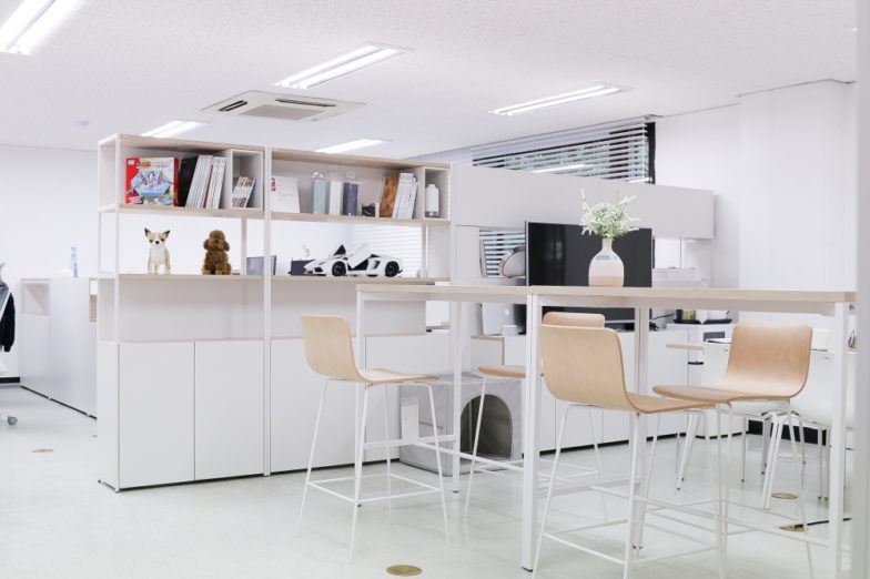 먼저, 기존에 논의했던 데로 일하는 곳, 만나는 곳, 연구하는 곳, 보관하는 곳이 선반장을 통해 각각 다른 공간으로 나뉘었습니다. 사실 처음 배치도를 받았을 때 보통 일반적인 가구들을 후면 마감에 그렇게 많은 신경을 쓰지 않는다는 것을 알고 있었기때문에 선반장을 통해 공간을 분리한다면 후면에 제대로 마감되지 않은 자재들이 지저분하게 보이지 않을까 많은 걱정을 했었습니다. 하지만 실제로 설치된 선반장들의 후면은 전면과 마찬가지로 깔끔하게 마감되어있었고 그 흔한 볼트 구멍 하나 노출되지 않도록 설계되어 있더군요. 후에 데스커 디자이너에게 물어보니 크지 않은 임대공간을 활용할 수밖에 없는 스타트업들이 공간분리를 할 수 있도록 도와주고 싶어 특별히 신경 쓴 부분이라고 하더라고요. 가장 만족하는 부분이었습니다.