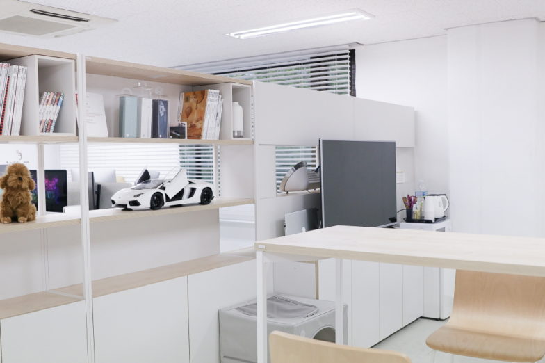 그리고 가구의 컬러 배분을 통해 공간마다 조금씩 다른 이미지를 줄 수 있었습니다. 사무공간은 화이트 컬러로 차분하게, 미팅공간은 밝은 우드톤으로 친근하게, 연구하는 공간은 어두운 우드톤으로 집중도 있게, 그리고 창고공간은 어두운 컬러로 지저분한 것들이 감추어질 수 있도록 컬러를 구성해 주었는데 여기저기 옮겨가며 일할 수 밖에 없는 제품 개발 담당자로서는각각 다른 분위기가 더욱 집중에 도움을 주어서 아주 좋았습니다.