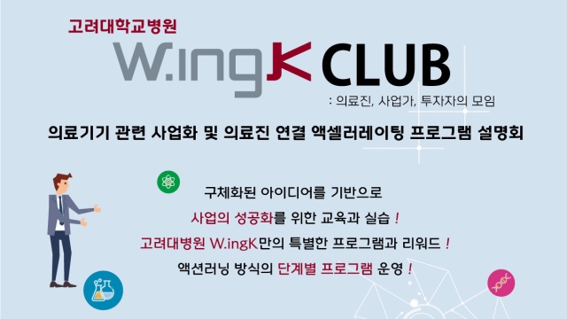 ◇ [6월 22일 금] W.ingK Club 의료기기 스타트업 액셀러레이팅 프로그램 설명회=고려대학교병원이 직접 만든 의료기기 스타트업 액셀러레이팅 프로그램 W.ingK CLUB 프로그램 설명회가 6월 22일 금요일 오후 3시부터 강남구 역삼로 마루 180 지하 1층 이벤트홀에서 개최된다. W.ingK CLUB 액셀러레이팅 프로그램은 구체화된 아이디어를 기반으로 사업 성공화를 위한 교육과 실습으로 의료기기 관련 사업화 및 의료진 연결을 돕는다. 이번 행사에서는 정재범(의료기기상생사업단 연구교수)의 인사말로 시작해 함병주(고려대학교 안암병원 연구부원장)의 축사와 이상헌(고려대학교 안암병원 P-HIS 개발사업단장)이 의료기기 사업화 성공사례, 정재범(의료기기상생사업단 연구교수)의 W.ingK 액셀러레이팅 프로그램 설명으로 진행되며 MOU 협약식과 네트워킹이 있을 예정이다. 액셀러레이팅 프로그램 참여기업 혜택은 의료진, 기업 매칭(1:1), 팁스 우선 추천, 고려대 기술지주회사 우선 투자기회 부여, 의료원장 명의 수료증, 특허 출원 지원이 있을 예정이다, 자세한 내용과 참가 신청은 이곳에서 확인할 수 있다.
