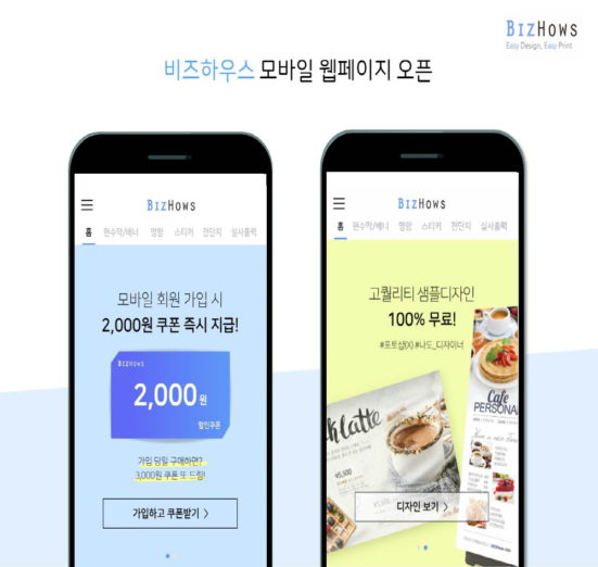 ◇ 비즈하우스, 신규 회원 할인쿠폰 지급 이벤트=비즈하우스가 주문 배송 조회와 쿠폰 적립 기능 등 사용자 편의 기능을 반영한 모바일 웹페이지를 열었다. 또 명함이나 전단지, 현수막, 배너 등 상품 샘플 디자인도 살펴볼 수 있다. 그 뿐 아니라 네이버와 구글 계정을 통한 간편 회원 가입도 할 수 있다. 비즈하우스는 추후 카카오톡 로그인을 추가하는 등 지속적으로 콘텐츠를 간편하게 이용할 수 있도록 개선해나갈 예정이라고 밝혔다.
