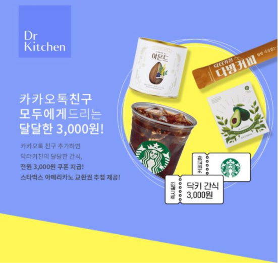 ◇ 닥터키친, 카카오톡 플러스친구 이벤트=닥터키친이 카카오톡 플러스 친구 추가 이벤트를 진행한다. 카카오톡 친구 추가 후, 이벤트를 통해 응모하는 모든 사람들에게 닥터키친 커머스 3,000원 할인 쿠폰을 문자로 보내준다. 할인 쿠폰으로 설탕 걱정 없는 닥터키친 다방커피, 유화제를 첨가하지 않은 건강한 아몬드 3종 등을 할인 받을 수 있다. 또한, 매월 10일 응모자 중 20명씩 추첨하여 스타벅스 아메리카노를 지급할 예정이다. 한편, 닥터키친은 카카오톡 플러스친구를 통해 ‘닥터키친 똑똑 정보통’의 콘텐츠를 매주 제공하고 있다. 똑똑 정보통은 식습관 오해 바로잡기 특집, 건강한 레시피 소개, 당뇨 환자를 위한 메뉴 및 식재료 소개 등 다양한 콘텐츠로 구성되어 있다. 또한, 1대 1 채팅을 통해 당뇨 식단에 관한 궁금증도 해결할 수 있다.