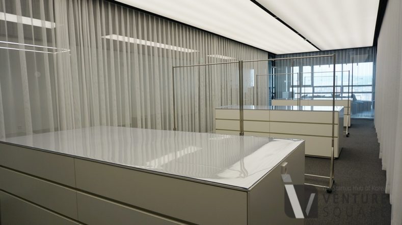 공유 오피스에서 쇼룸공간을 보게 될 줄이야. 패션업에 특화된 공간이 맞구나 싶었다. 쇼룸안에는 넓은 테이블과 행거등이 구비돼있어 패턴실과 워크룸으로 활용되며 비즈니스 미팅 시에는 제품을 전시하고 프레젠테이션을 하는 공간으로도 활용된다고 한다.