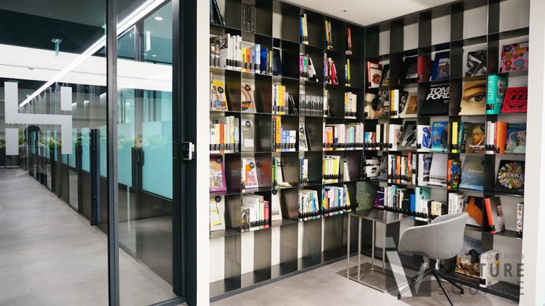 입주공간이 위치한 12층에 도착하자 ‘무신사가 만든 공유오피스’란 문구가 가장 먼저 눈에 들어왔다. 방향을 틀어 입구에 들어서니 왼쪽편에 놓인 대형 스크린이 시선을 사로잡는다. 지금까지 방문해봤던 여러 공유오피스와는 확연히 다른 분위기. 대부분의 공유 오피스가 집처럼 아늑한 분위기를 연출하기 위한 조명과 인테리어를 갖췄다면 이곳은 블랙&화이트 컨셉트를 기본으로 시크하고 세련된 분위기를 강조했다. 마치 엔터테인먼트 기획사나 패션 회사를 찾아온 것 같은 느낌이다.