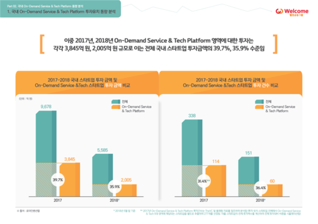 보고서에 따르면 2017년과 2018 상반기 국내 스타트업 투자규모는 각 9,678억 원, 5,5585억 원으로 집계됐다. 이 중 대표적인 온디맨드 서비스 분야 자동차·모빌리티 ▲음식·배달 ▲홈서비스·예약 ▲레져·인포테인먼트 ▲펫·룩 영역 투자 규모는 2017년 3,845억, 2018년 5월 말 기준, 2,005억 원으로 전체 투자대비 39.7%, 35.9% 수준에 달하는 것으로 나타났다.