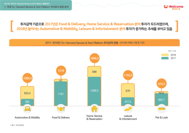 2018년에는 자동차·모빌리티, 레저·인포테인먼트 영역에 공격적인 투자가 이루어지고 있다는 분석이다. 2018년 5월 말 기준, 온디맨드 서비스 영역 투자유치 상위 10개 기업은 쏘카(600억 원)를 비롯해 트리플, 왓챠, 와그트래블 등이다. 투자금액 대부분이 상위 10개 기업에 집중되어 있다.
