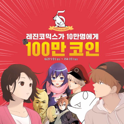 ◇ 레진코믹스, 5주년 기념 사은 이벤트=레진코믹스가 6월 27일부터 7월 4일까지 일주일간 5주년 감사 이벤트를 진행한다. 행사 기간 중 유료 에피소드를 구입한 고객 중 추첨을 통해 모두 10만 101명에게 135만 5,000 보너스 코인을 지급하는 ’10만명에게 100만 코인을 쏩니다!’, 그동안 사용자에게 사랑받은 작품으로만 구성한 ‘역대 1위 만화, 1코인 이벤트’, 기간 중 코인을 충전하면 충전 금액에 따라 최대 100코인을 추가 지급해주는 ‘코인충전하면 최대 100코인 더!’도 진행한다. 자세한 내용은 홈페이지를 참고하면 된다.