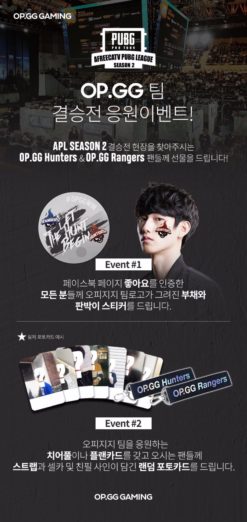 ◇ 오피지지 게이밍, APL 시즌2 결승전 현장 이벤트=오피지지의 e스포츠 구단인 오피지지 게이밍이 아프리카TV PUBG 리그 프로 투어 시즌2 결승전에 진출한 헌터스와 레인저스를 축하기 위한 특별 현장 이벤트를 진행한다. 이번 리그에서 순위에 따라 포인트를 획득하면 독일에서 열리는 펍지 글로벌 인비테이셔널 2018에 진출할 기회를 얻을 수 있다. 이벤트는 헌터스와 레인저스 팬 모두 즐길 수 있는 행사로 현장에서 오피지지 게이밍 페이스북 페이지 좋아요와 팔로잉만 인증하면 팀 로고를 새긴 판박이 스티커와 부채를 받을 수 있다. 또 치어풀이나 플랜카드를 직접 제작해온 선착순 20명에게는 로고를 각인한 고급 스트랩과 미공개 선수 사진으로 만든 친필 사인 포토카드도 증정한다. 결승전은 6월 30일 장충체육관에서 열리며 결승전 티켓은 29일까지 티켓링크를 통해 구입할 수 있다.