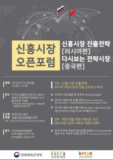 ◇ 한국모바일게임협회, 게임 신시장 개척을 위한 신흥시장 오픈포럼=한국모바일게임협회가 러시아 신흥시장 진출 전략과 중국 재도약을 위한 새로운 시선을 주제로 오는 7월 12일 14시 판교 더퍼스트클래스에서 오픈포럼을 개최한다고 밝혔다. 1부에선 한국콘텐츠진흥원의 시장 진출 전략 외에 Zorka.mobi CMO와 김지영 앤유 마케팅 차장, 몬스터크라이이터널 러시아 시장 진출 사례 등을 공유할 예정. 2부에선 김두일 네오윈게임즈 대표가 중국 진출 방법과 최신 트렌드 등을 발표한다. 황성익 한국모바일게임협회장은 “이번 오픈포럼을 통해 한국 모바일 게임산업의 해외진출이 가속화되고 해외 신흥시장에 대한 이해 범위를 넓힐 수 있는 계기가 마련되길 바란다”고 밝혔다. 오픈포럼 사전 신청은 이곳에서 확인할 수 있다.