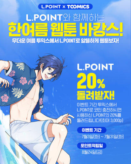 ◇ 투믹스, 롯데멤버스 엘포인트 페이백 이벤트=투믹스가 여름 시즌을 맞아 롯데멤버스와 7월 3∼31일까지 엘포인트 사용 고객에게 20%를 돌려주는 페이백 행사를 실시한다. 행사 기간 동안 엘포인트로 코인 상품을 결제하면 포인트를 합산, 사용 포인트 중 20%, 회원당 최대 3,000포인트 페이백을 해준다. 엘포인트를 이용 중인 투믹스 회원이라면 누구나 참여할 수 있다. 페이백 포인트는 8월 24일 일괄 지급된다. 엘포인트는 자사 모바일앱 날마다 가게 카테고리를 통해 투믹스 웹툰을 서비스 중이며 투믹스는 자사 코인 상품 충전소에 엘포인트를 결제 수단으로 추가한 바 있다.