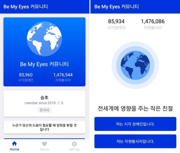현재 비마이아이즈 커뮤니티에는 약 8만5천명의 시각장애인과 약 147만명의 자원봉사자가 활동하고 있다. 150개 이상 국가에서 사용되는 비마이아이즈는 한국어를 포함해 180개 언어가 지원된다. 영어 사용자가 가장 많으며 프랑스, 독일어, 덴마크어 등이 주다. 자원봉사자는 가입 시 사용 가능한 언어를 여러 개 등록할 수 있다. 한국어 영어 모두 가능하다면 콜을 받는 횟수도 늘어난다. 2년동안 한국어 자원 봉사자를 했다는 한 봉사자는 한국에서도 전화가 오지만 해외에 유학하고 있는 한국인 시각장애인으로부터도 연락을 많이 받는다고 한다. 비마이아이즈 자원봉사자들은 봉사의 대가로 포인트를 받는다.